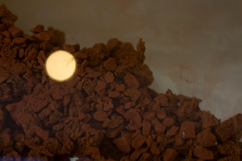 Untitled exhibition by Andro Dadiani is an act of saying goodbye to love. It reminds us of the violent interruption of ritual. The lack of a title represents the Author's dried, wordless and hopeless state. The exposition quote “saying goodbye is a sacred business” is periphrasing Andros lover, “said he” is from the Bible, how Job addresses the god, Artist imitating Job depicts his love as a God. The lyrical subject of the exhibition has to find a way in the darkness of forbidden, seized love, hopelessness and godlessness, using braille and characterless sounds as a guide. The Author gives special, metaphoric meaning to the physical weight, colour, and material of the things: Clay/dirt– as the central energy of death, birth and life. Materials: bread, human bones, iron, and glass also carry significant meaning as a metaphor for evolution, culture and possessing subordination. Sound: Giorgi Badurashvili, Ilia Migriauli
